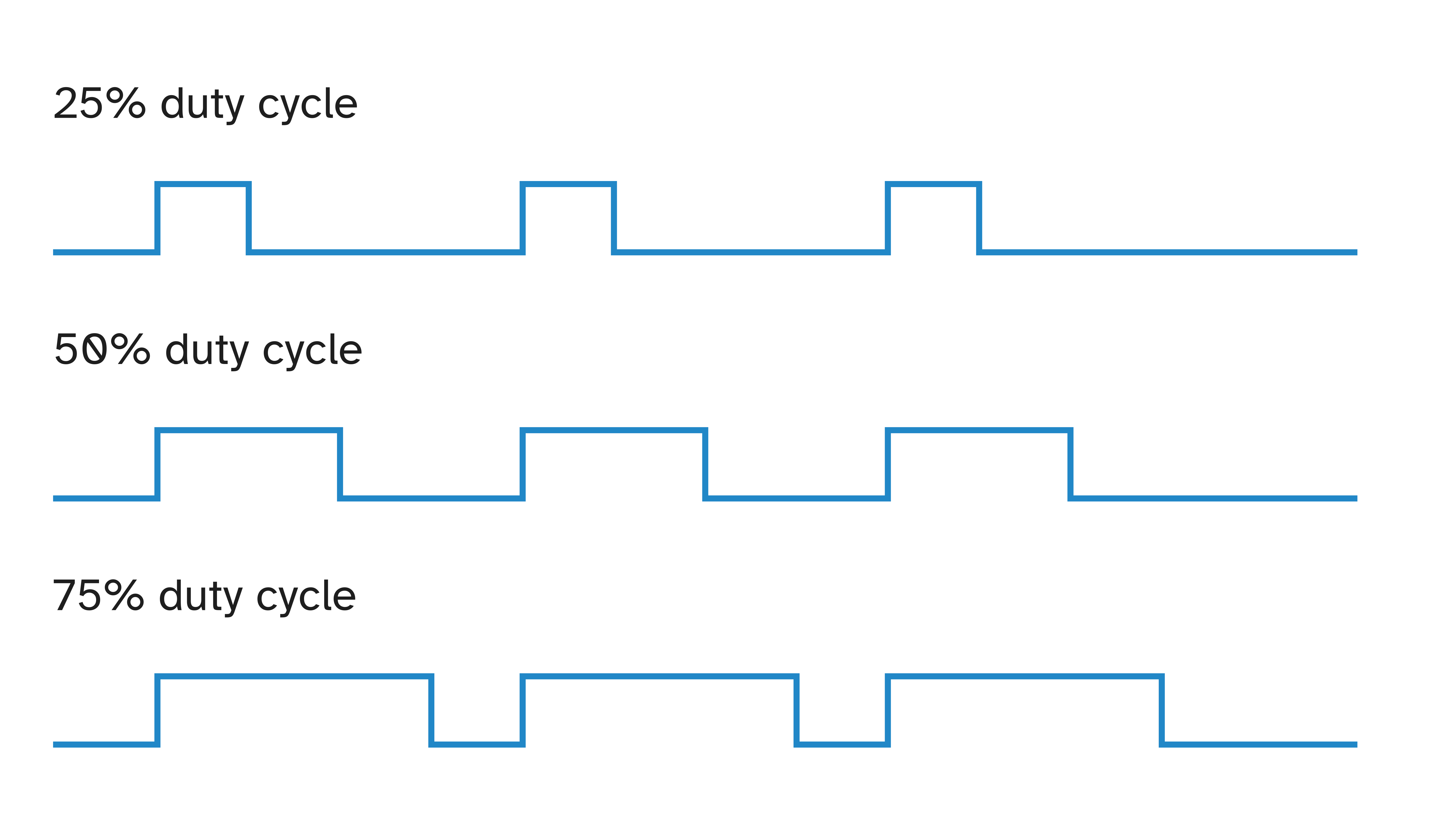 PWM signals are generated by microcontrollers at high frequencies (hundreds or thousands of times per second). To an electrical circuit or actuator, this repeated pulsing “averages out” into a smooth effect. For example, an LED driven with 50% duty cycle appears half as bright, even though it is actually turning fully on and off rapidly.