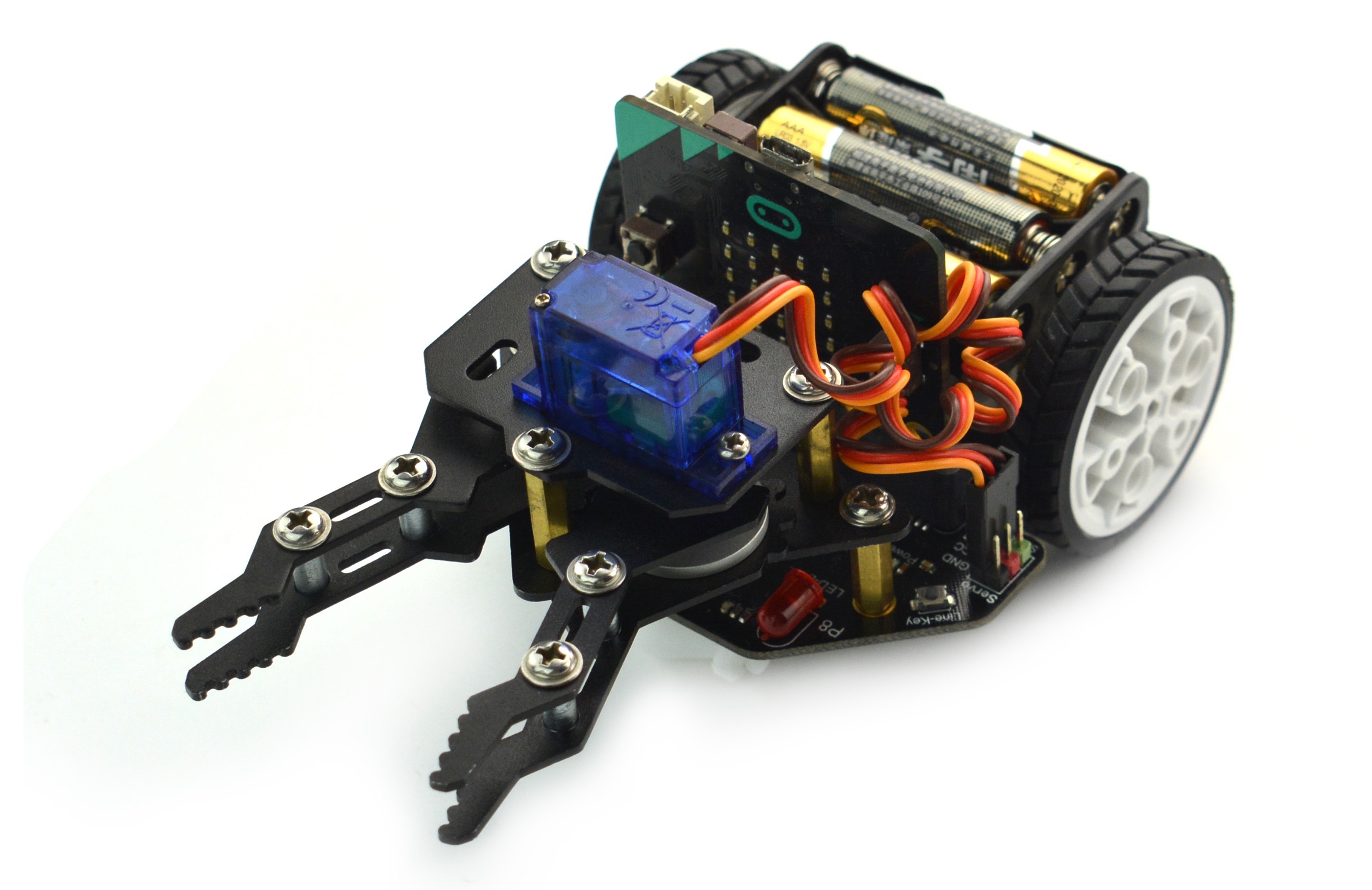 The gripper actuator attachment allows us to grab, hold and drag objects securely while the robot is moving. Opening and closing of the gripper jaws is controlled by a servo, which is a type of motor that holds a desired angle.