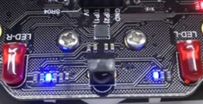 There are two blue LEDs on the front top of the Maqueen that indicate the line sensor state. When the LEDs are on it means no line is detected on the corresponding side. When they are off it means the line is detected.