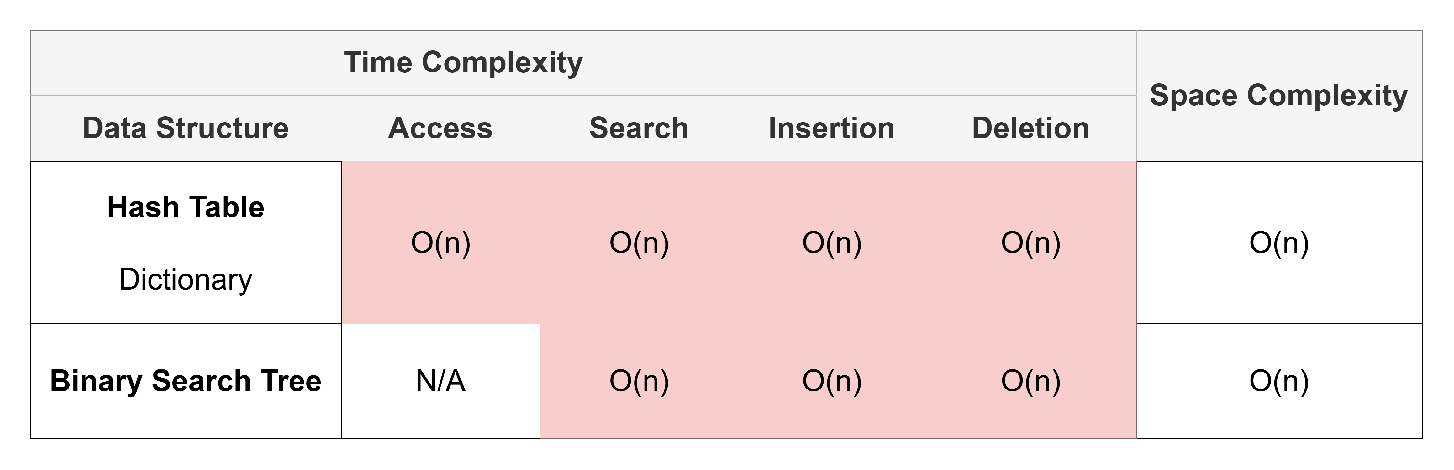 Notably, hash tables and binary search trees have \(O(n)\) worst case complexities for most actions. We’ll learn more about this later.