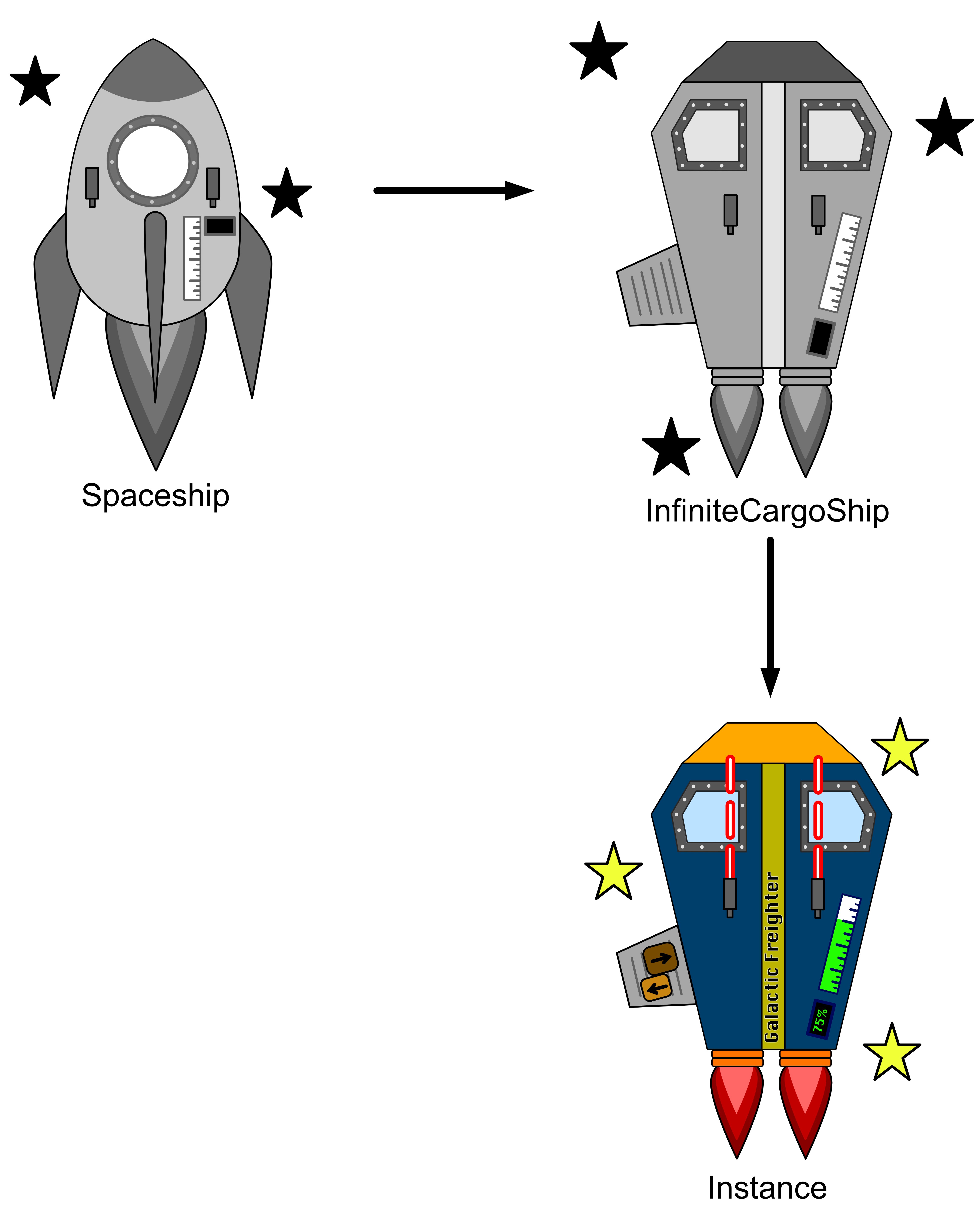 Add a child class of Spaceship called InfiniteCargoShip that is used to transport a potentially infinite amount of bulk cargo. The InfiniteCargoShip has: