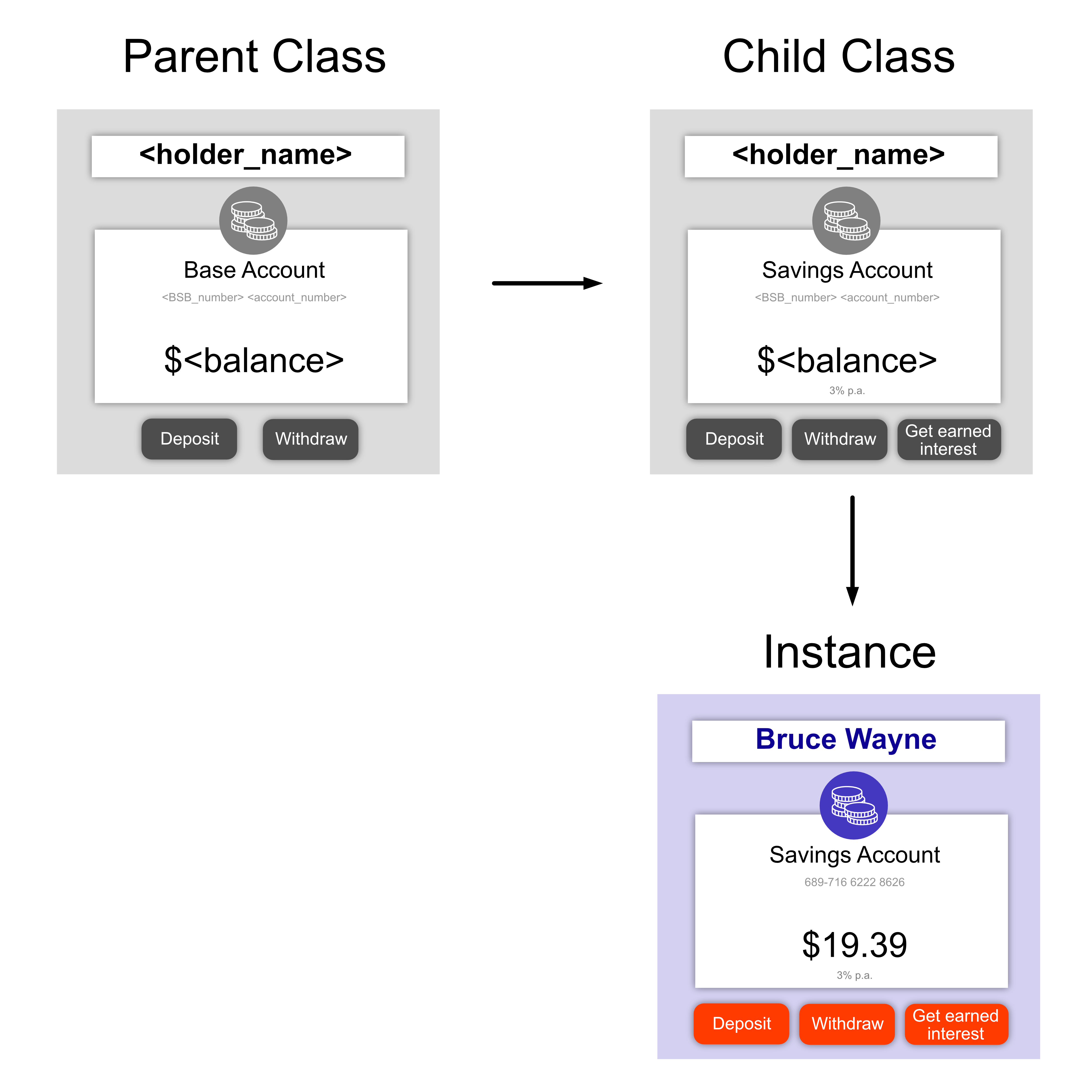 We’ve added one more attribute interest_rate to the child class, which is initialised in the constructor.