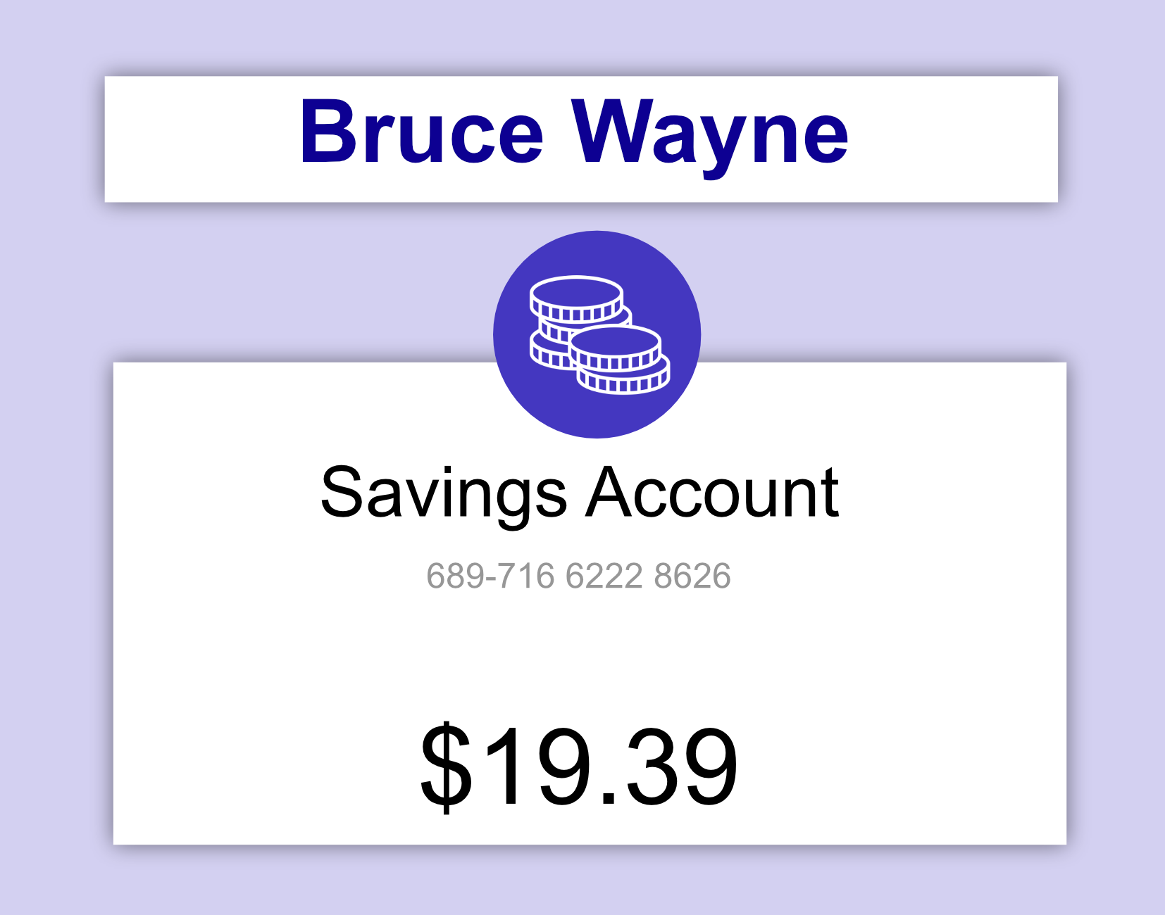 batman_account = Account("689716", "62228626", 19.39, "Bruce Wayne")