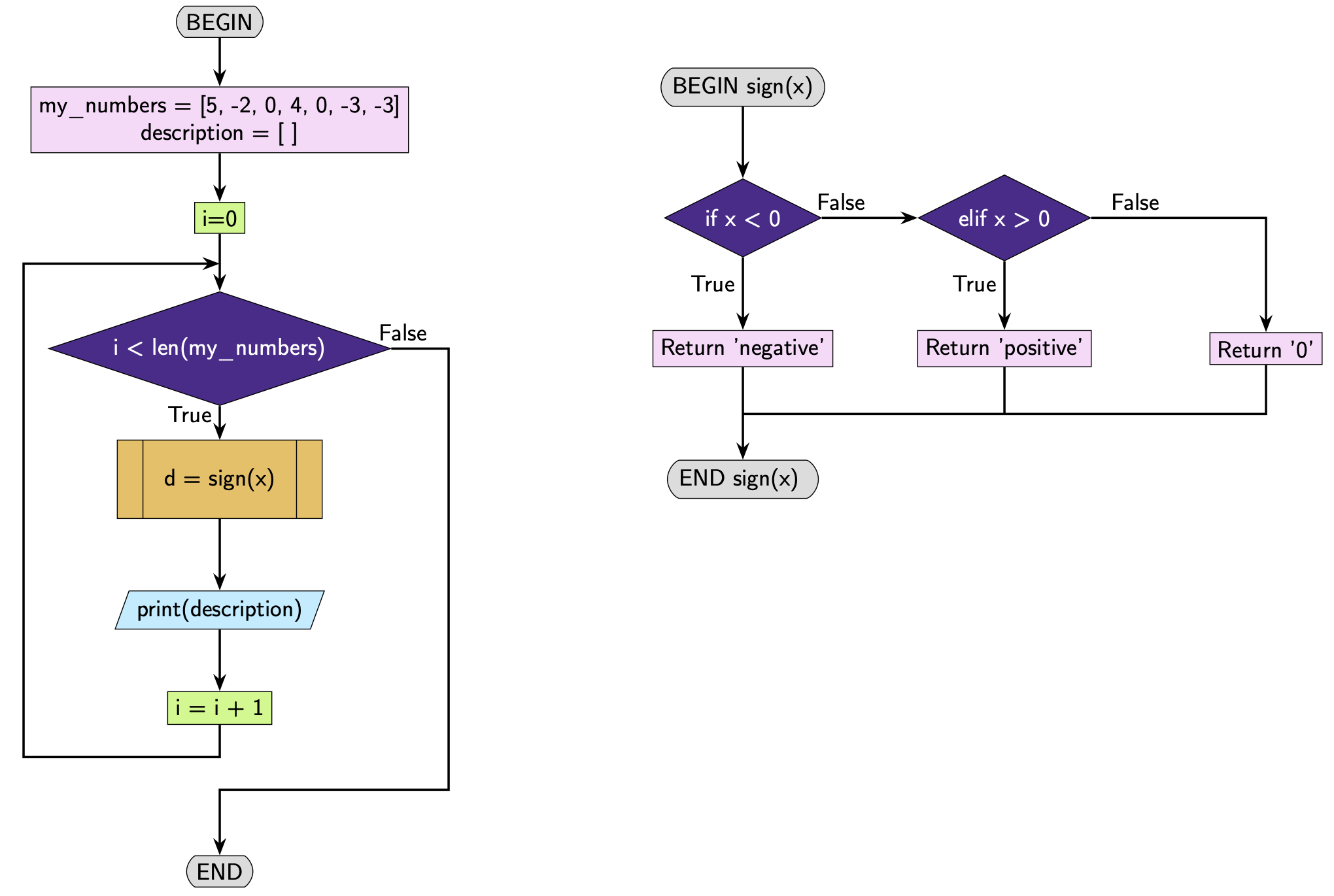 def sign(x): if x < 0: print('negative') elif x > 0: print('positive') else: print('0') my_numbers = [5, -2, 0, 4, 0, -3, -3] description = [] for i in range(len(my_numbers)): description.append(sign(my_numbers[i])) print(description)