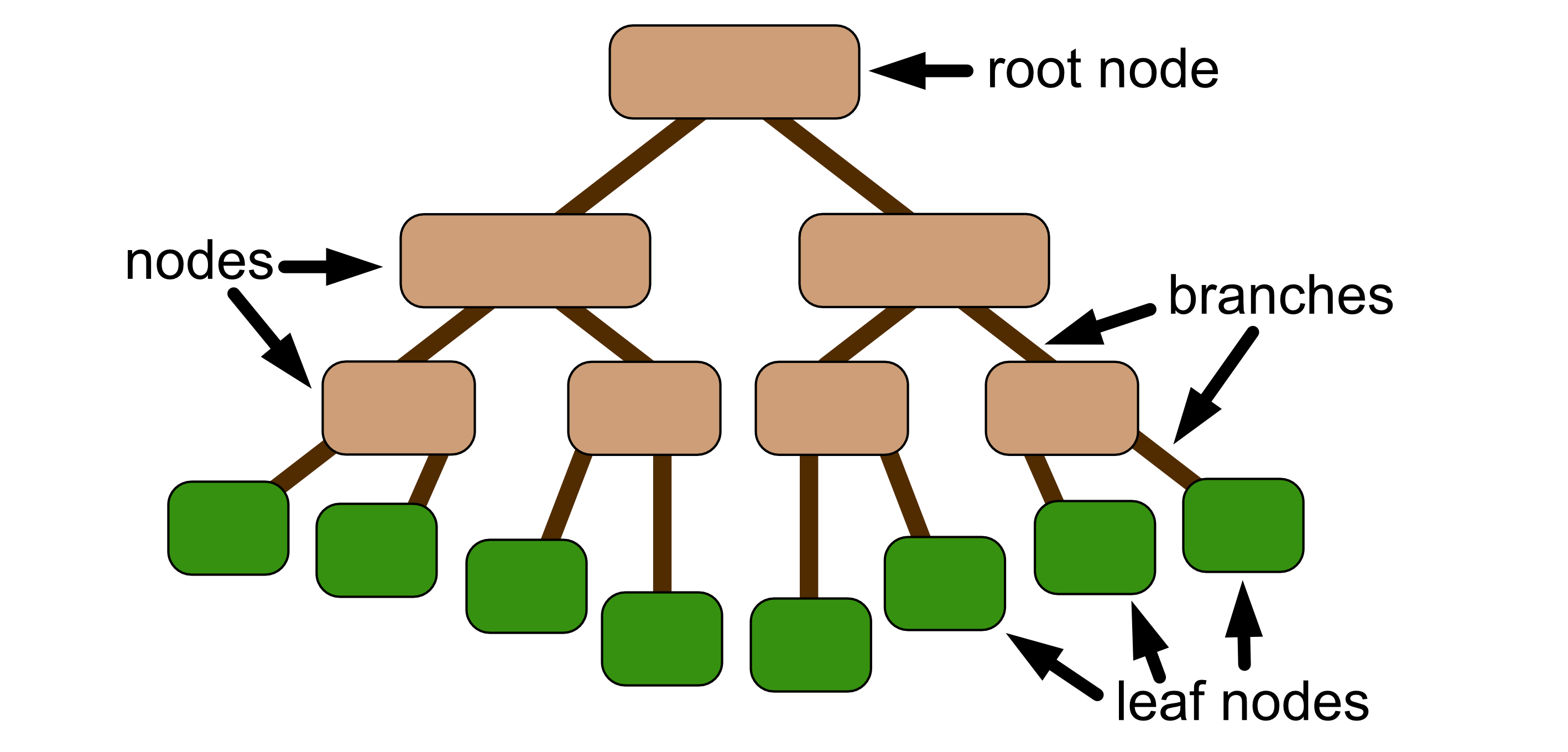 Decision trees are graphical trees that represents a decision making process. The tree is made up of nodes and branches. Each node represents a decision point and each branch represents the decision that is taken. The node at the top of the tree is called the root node, and this is the starting point of the tree. The nodes at the end (which do not have branches) are called the leaf nodes and they represent the final outcome/decision. This means a decision tree looks a bit like an upside down tree.