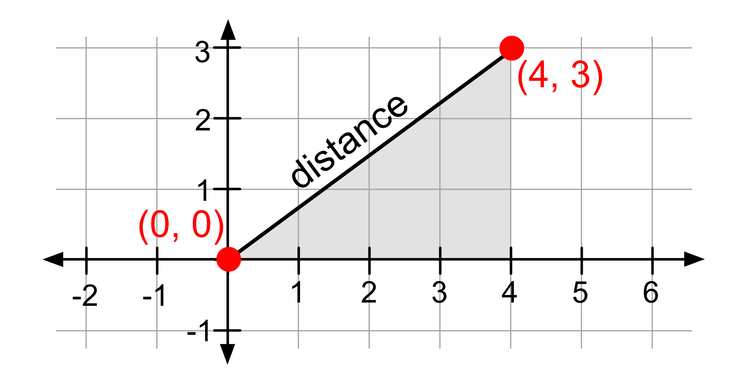 We see that the distance between the points (0, 0) and (4, 3) is 5. We can also verify this using Pythagoras’ Theorem. Recall that \(a^2 + b^2 = c^2\), in this case the length of the hypotenuse \(\sqrt{3^2 + 4^2} = \sqrt{25} = 5\).
