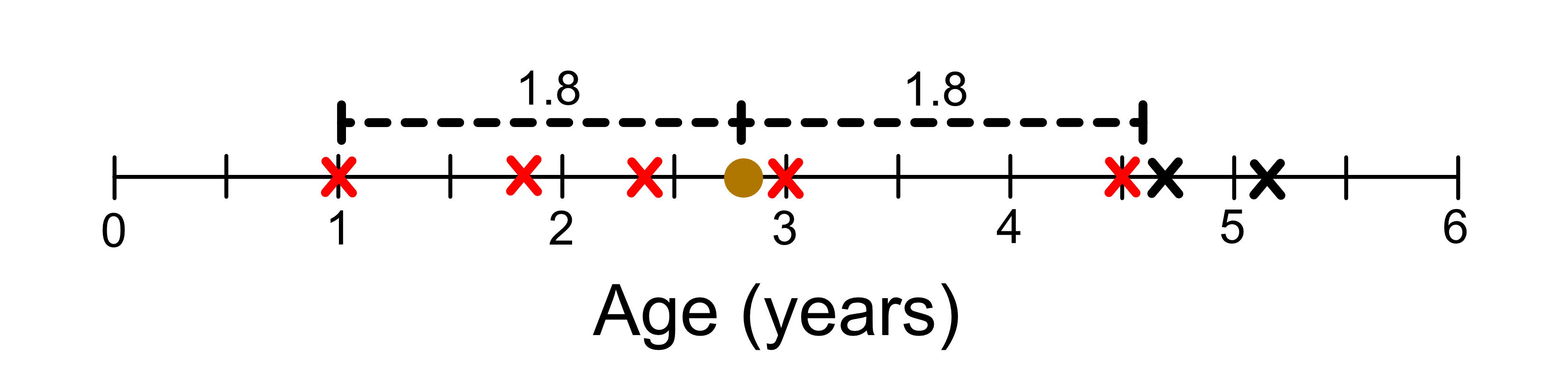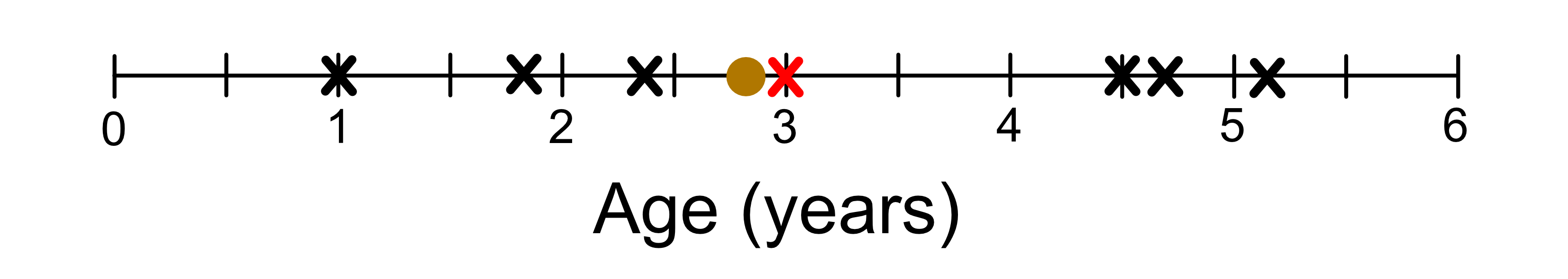 Now the way a KNN regression model makes a prediction is that it looks for the closest sample in the training data. For example, let’s say we wanted to predict the height of a giraffe who was 2.8 years old. The information we have on our unknown giraffe is just it’s age. If we were to plot just the age information it would look like this: