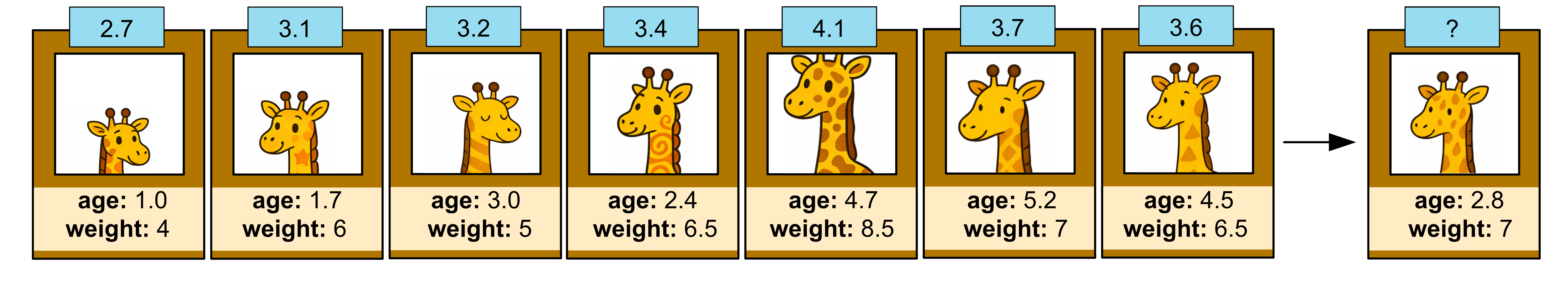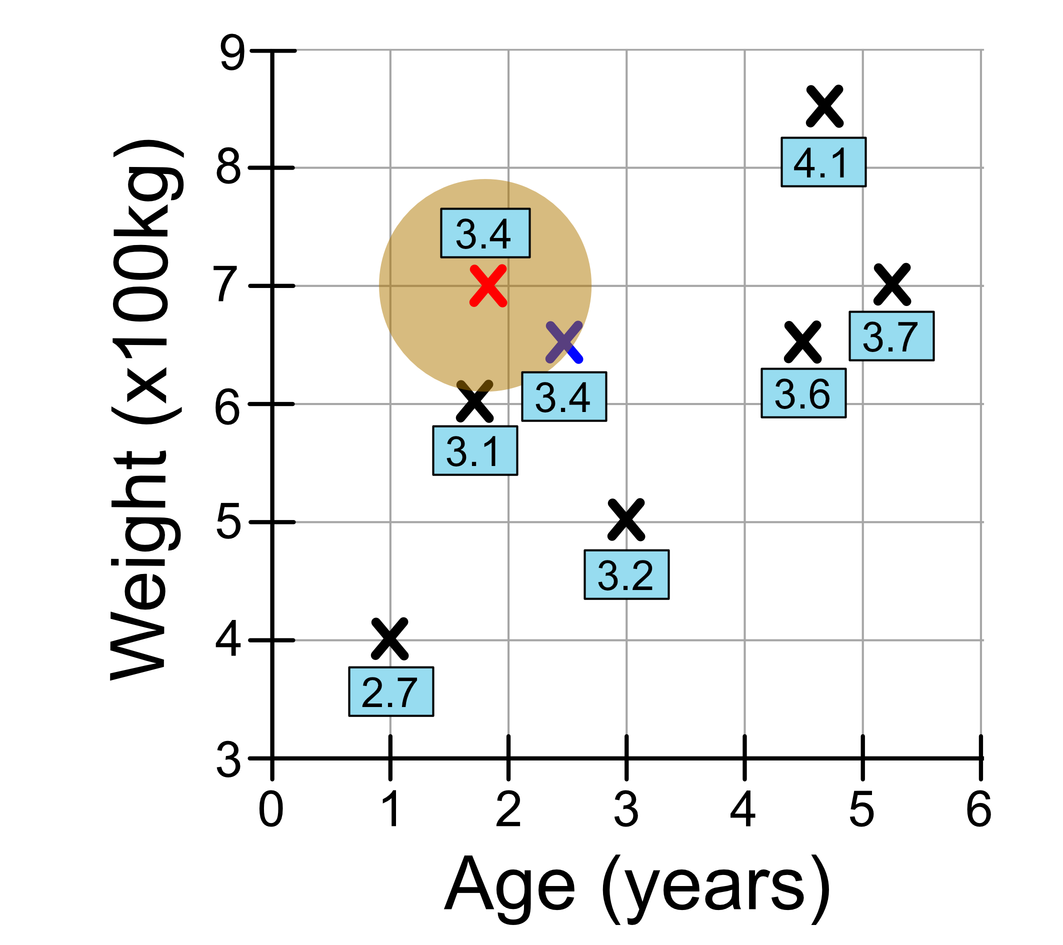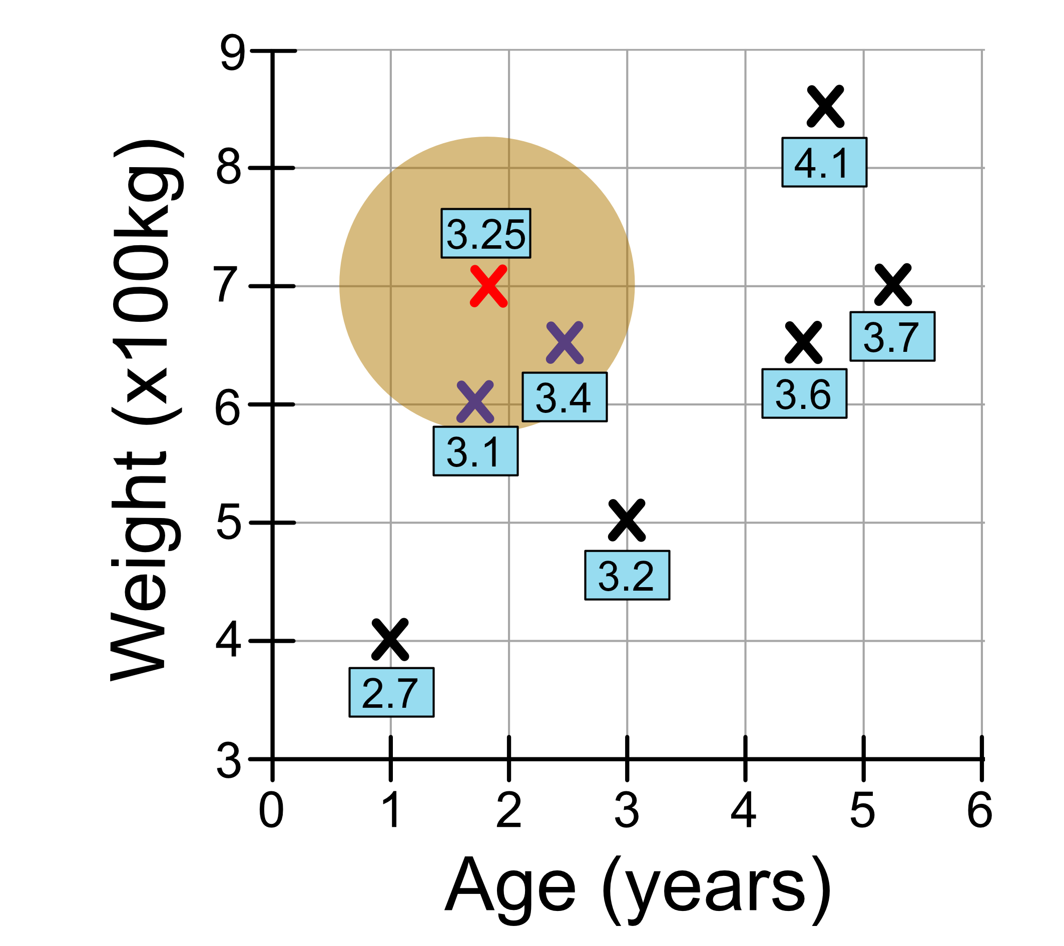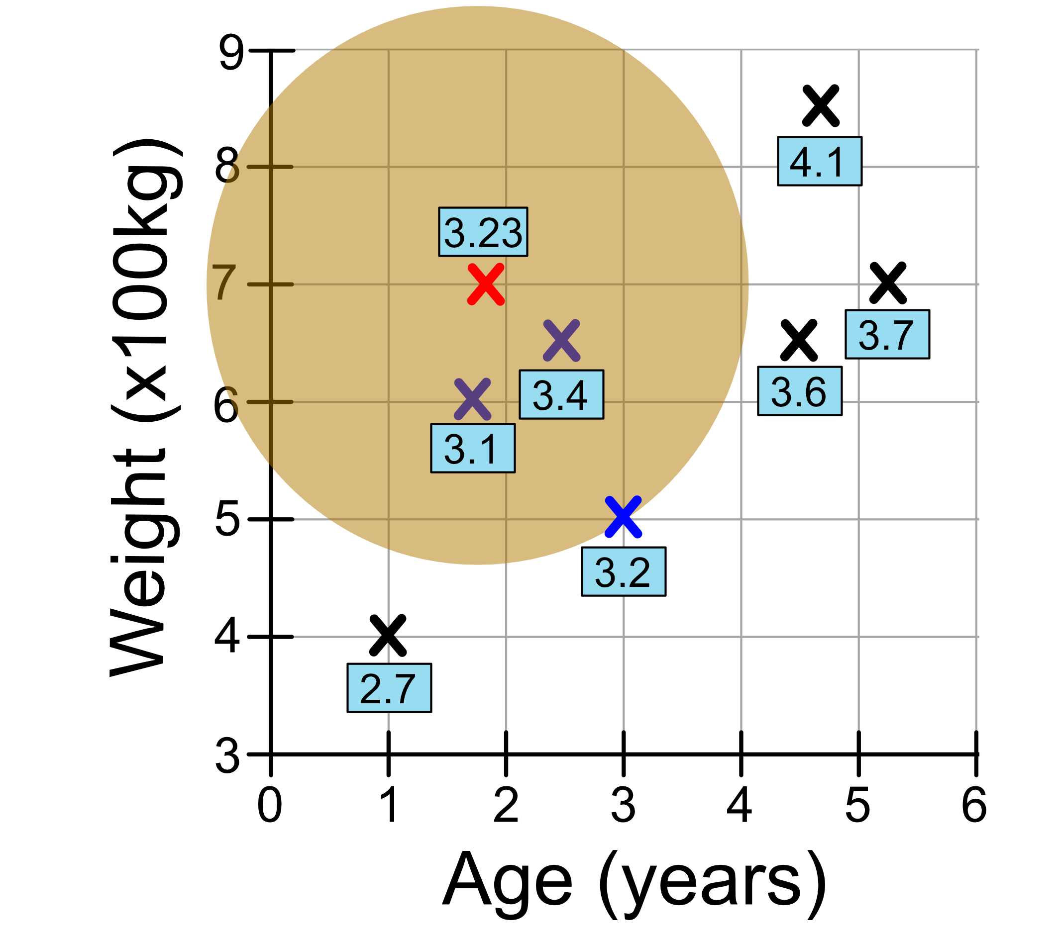 To make a prediction, we just look at the k closest neighbours. Let’s consider our test sample which is 2.8 years old and weights 7 tonnes.