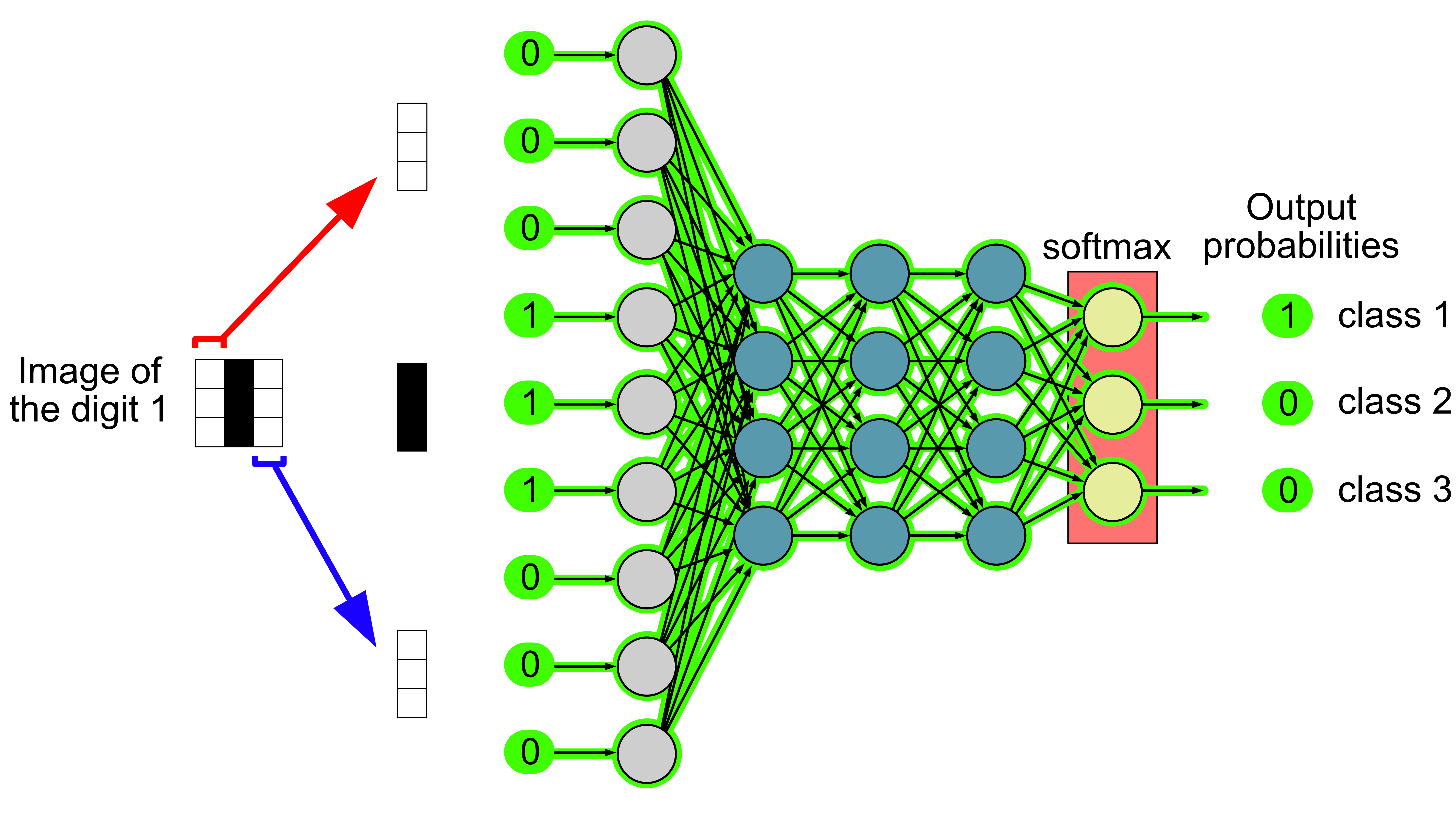 Here the input to our neural network is an image. We break the image up and feed each input neuron a pixel value. These values are propagated through the network and we make a prediction based on the highest probability. In this case, we predict class 1, i.e. the digit is a 1.