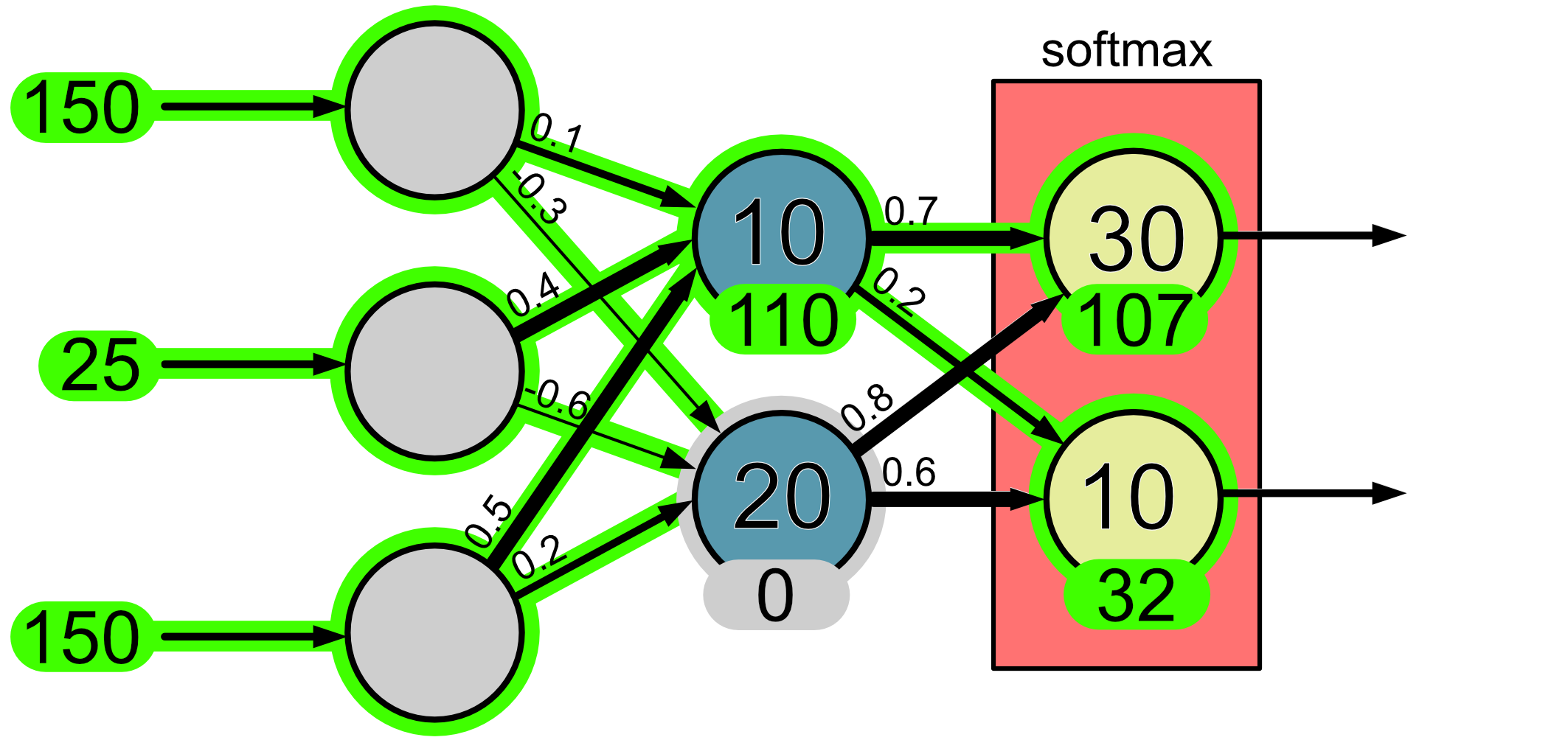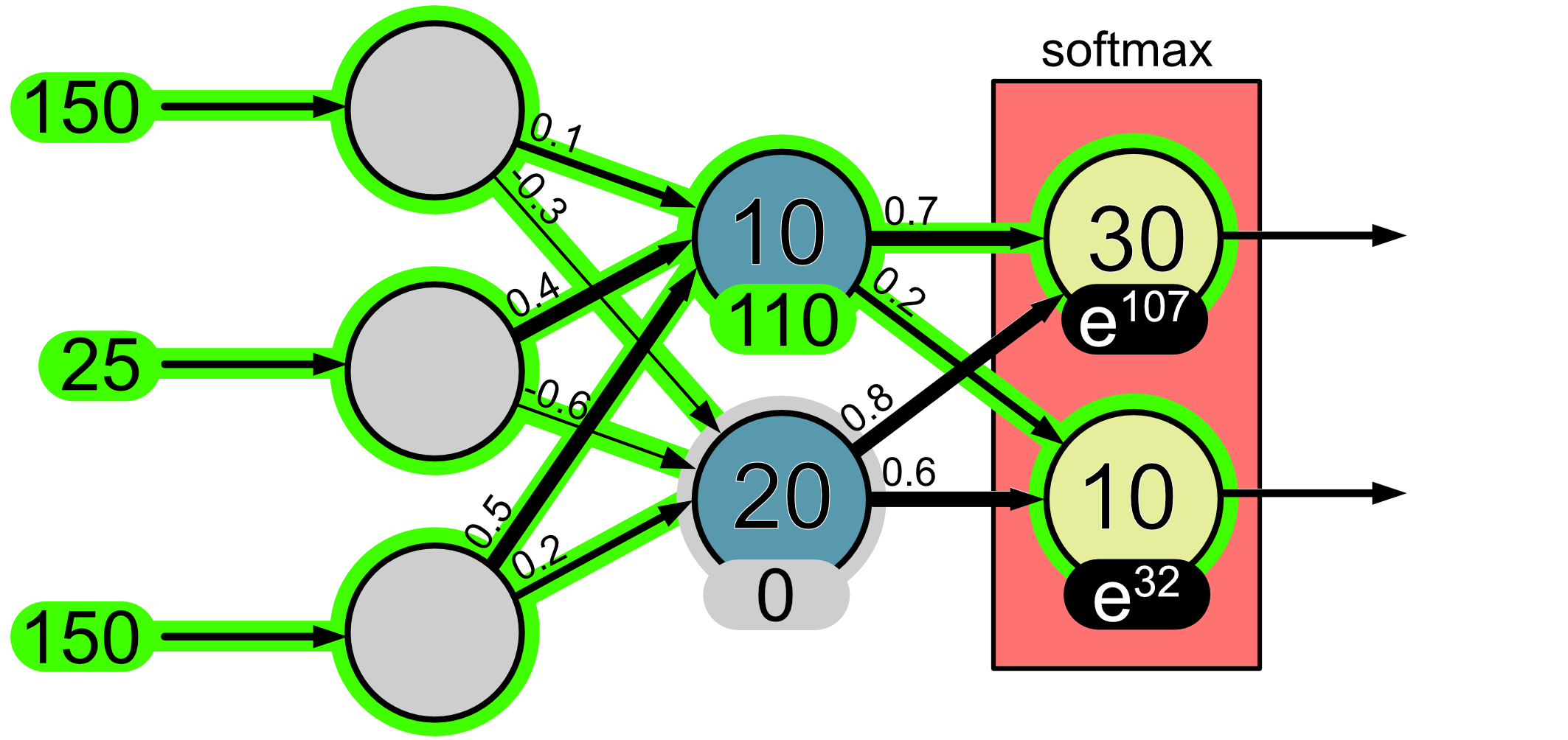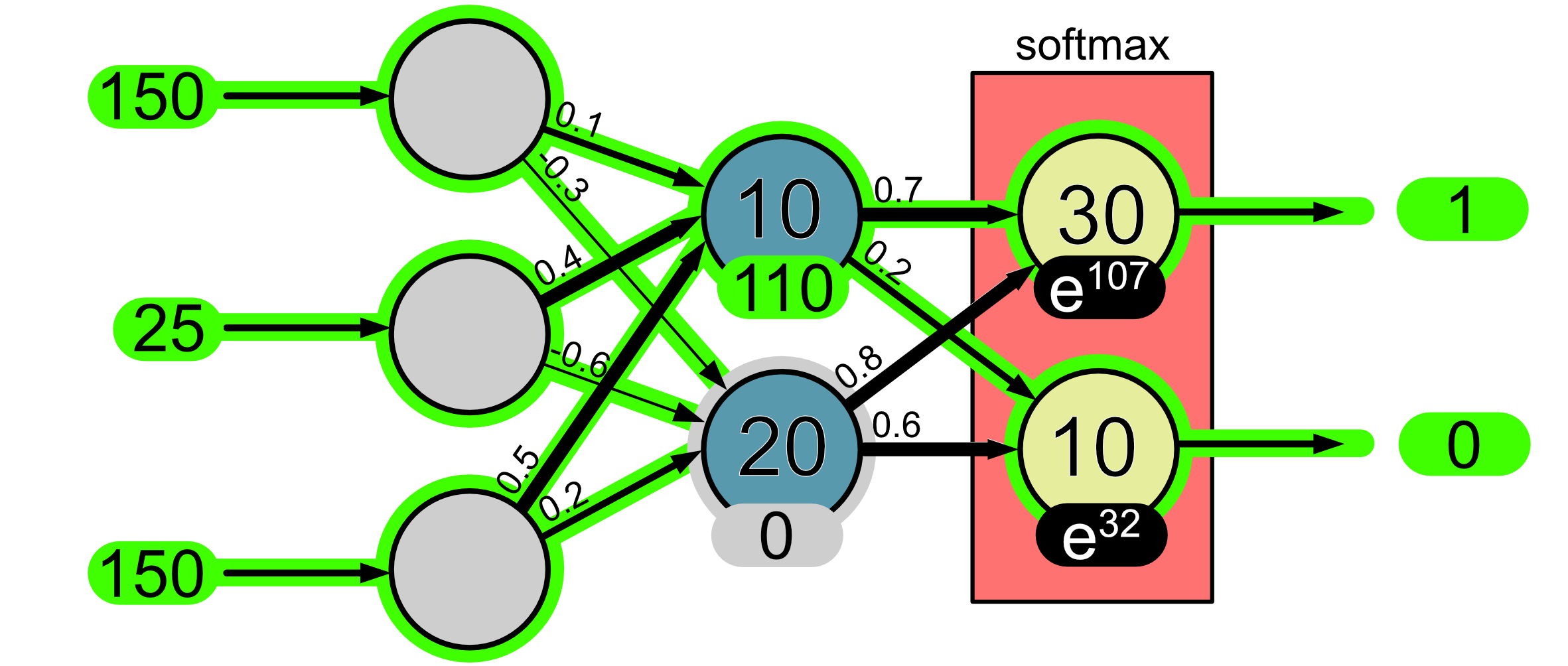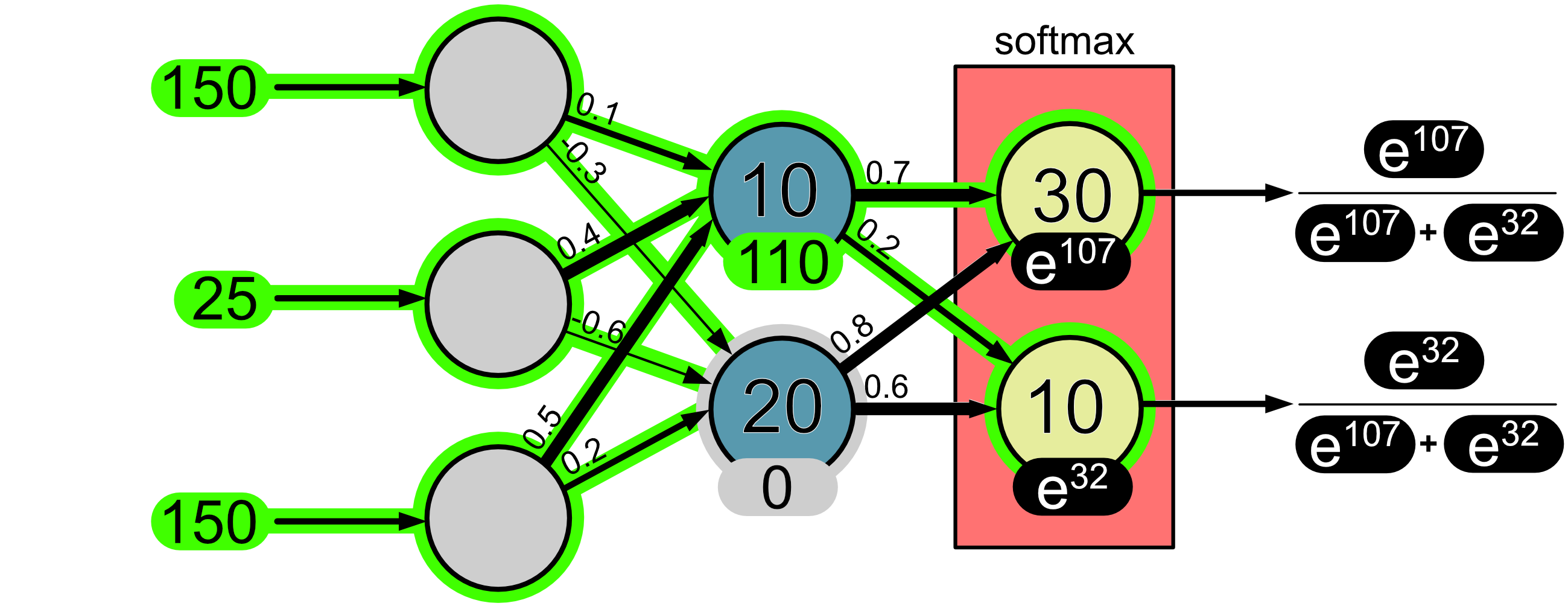 The purpose of the softmax layer is that it turns output values into probabilities. The way it does this is a little complicated, but let’s look at it with this example. Before we apply the softmax function our neuron outputs are 107 and 32.
