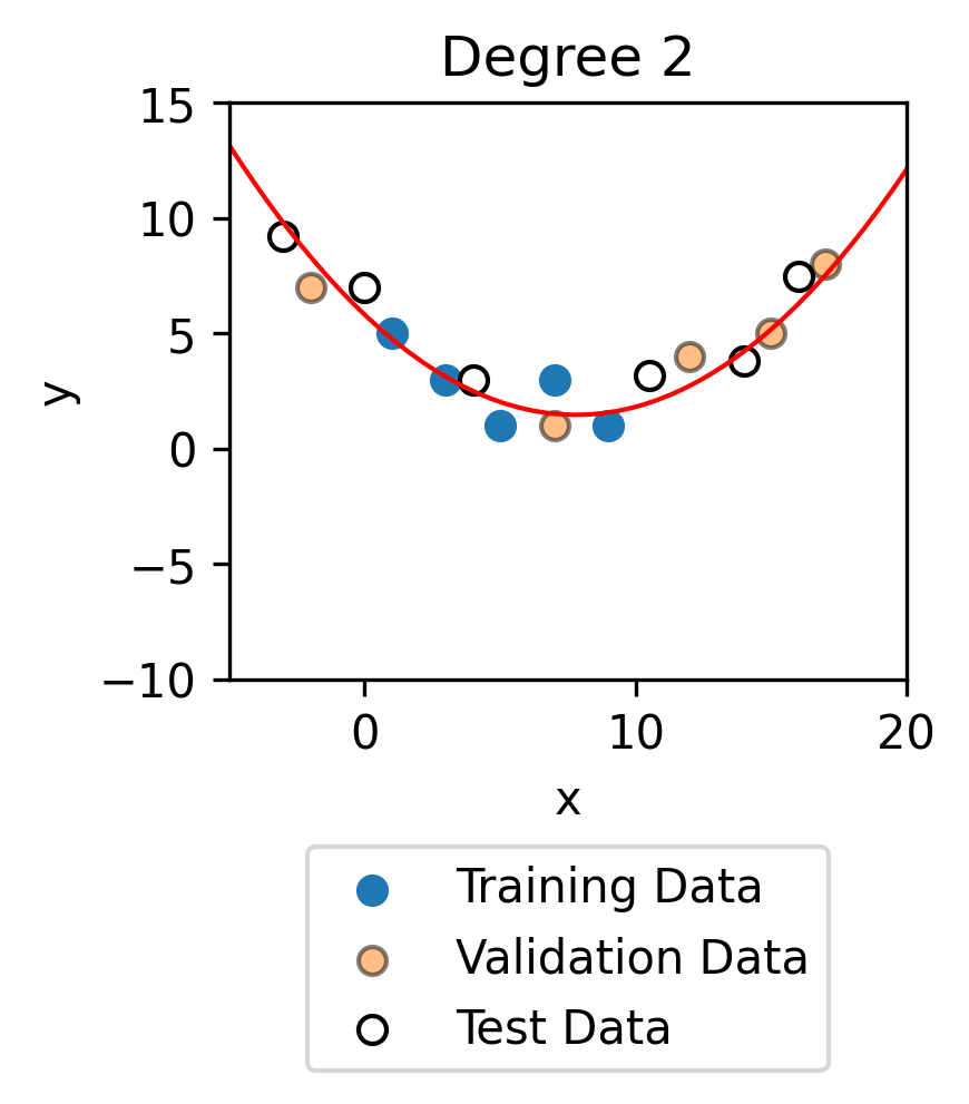 Comparing the validation MSEs we can see that the polynomial of degree 2 performs the best on the validation data. This means that we expect the polynomial of degree 2 to perform best on new data.