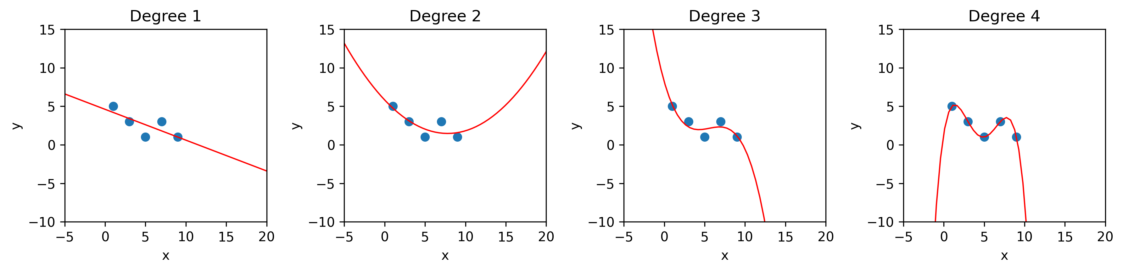 Comparing the mean squared errors (MSEs) we would find the polynomial of degree 4 performs best.