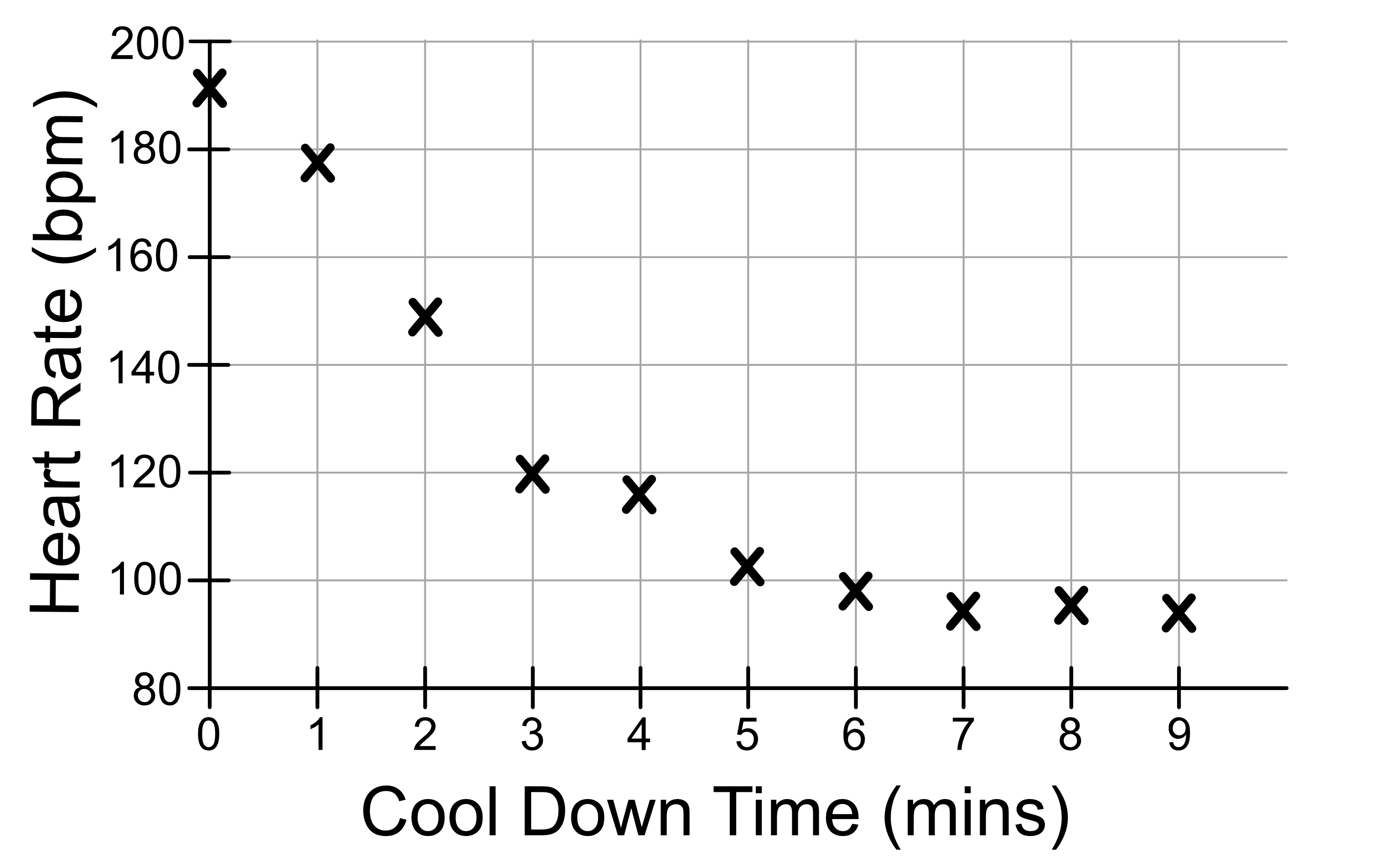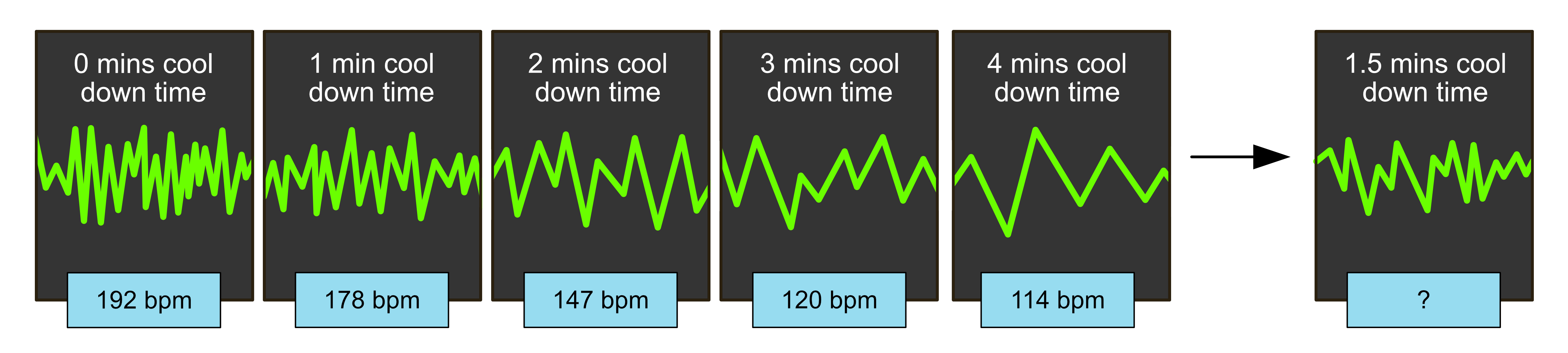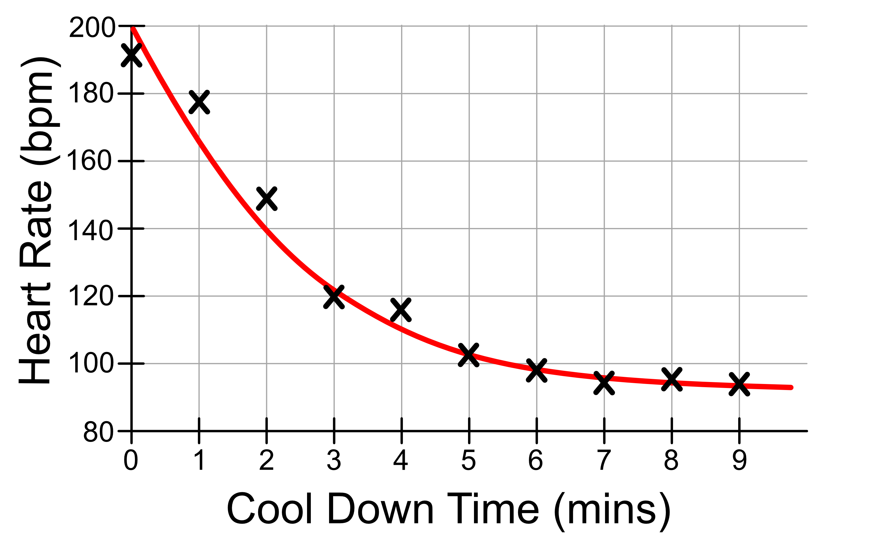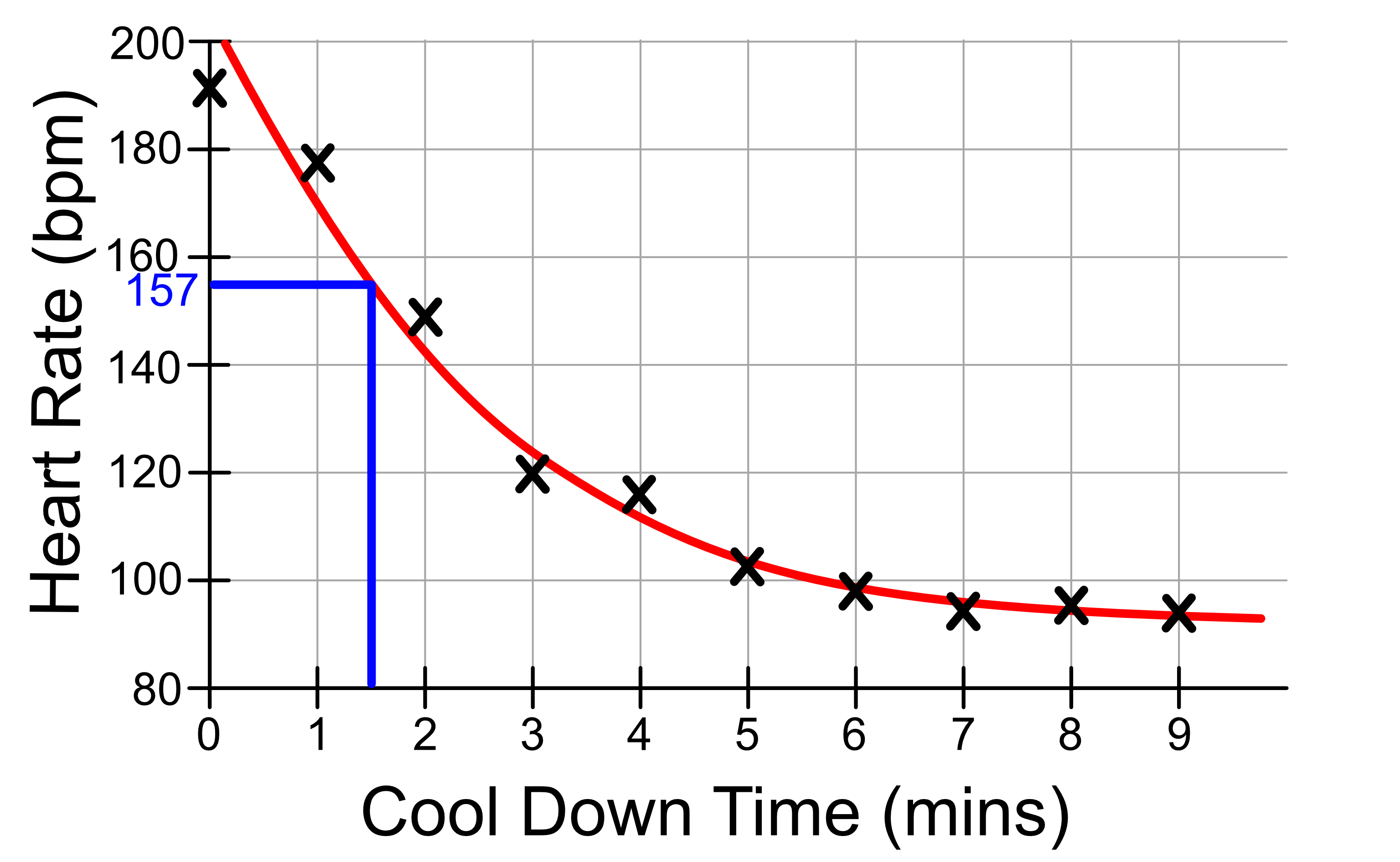 We can use this to predict the heart rate of the athlete at a given cool down time. For example, after 1.5 minutes of cool down, we expect the athlete to have a heart rate of 157 bpm