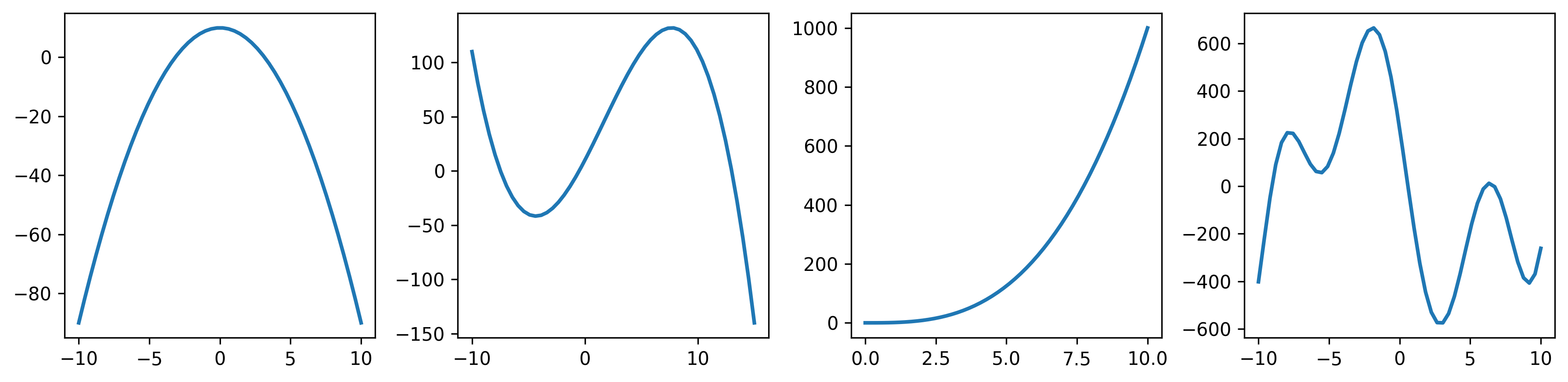 • \(y = \beta_0 + \beta_1 x + \beta_2 x^2 + \beta_3 x^3\) is a polynomial of degree 3, since the term with the highest degree is \(x^3\). This polynomial is a cubic, which looks like an ‘S’.