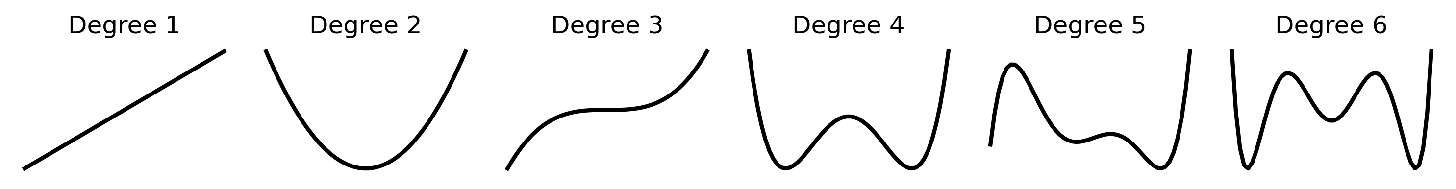 where \(p\) is the degree of the polynomial. The polynomial degree can be arbitrarily large. Typically as the polynomial degree increases, the number of ‘wiggles’ in the function increases.