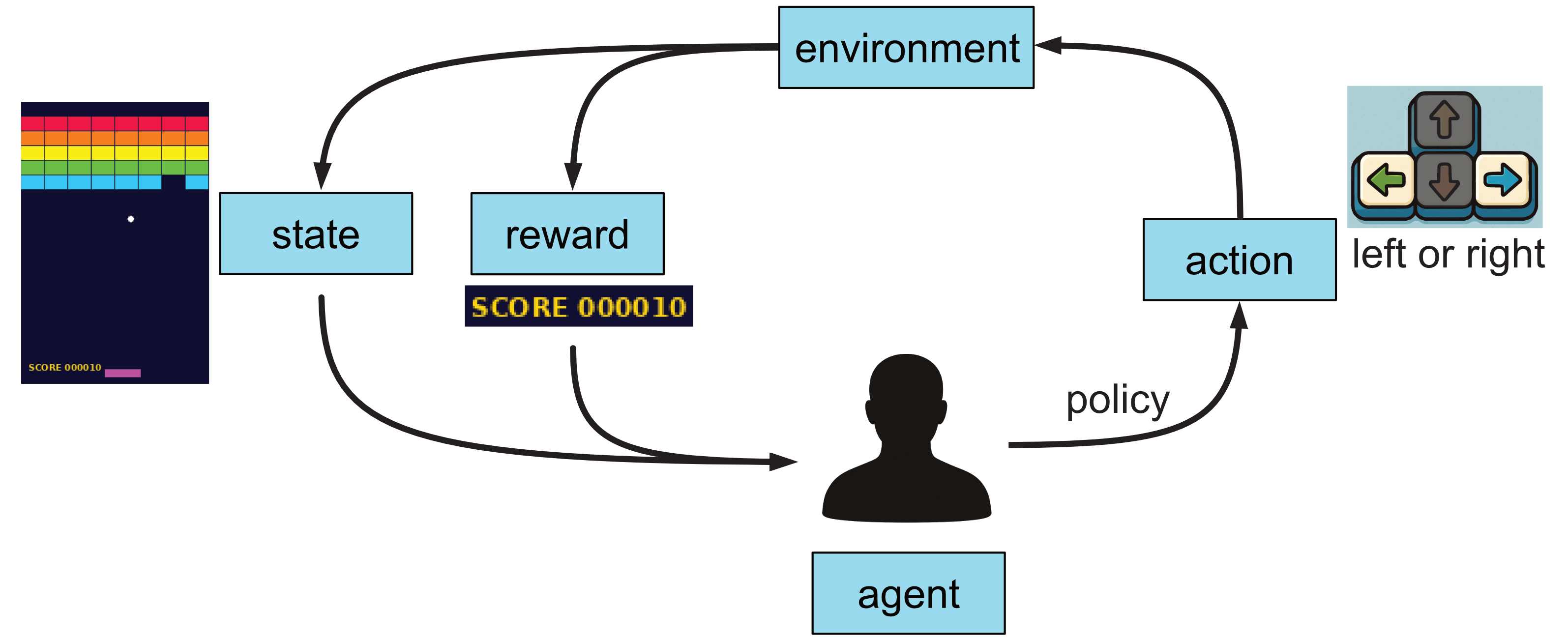 In addition to receiving a reward, we also have access to the game state, which represents the current status of the game. The agent learns a policy that guides its decision to move the platform left or right, depending on this state. When the agent starts learning, it’s decision to move left or right will be quite random. As the agent plays the game more, it learns whether to move left or right based on the game state to maximise its score, which means it gets better at playing the game.