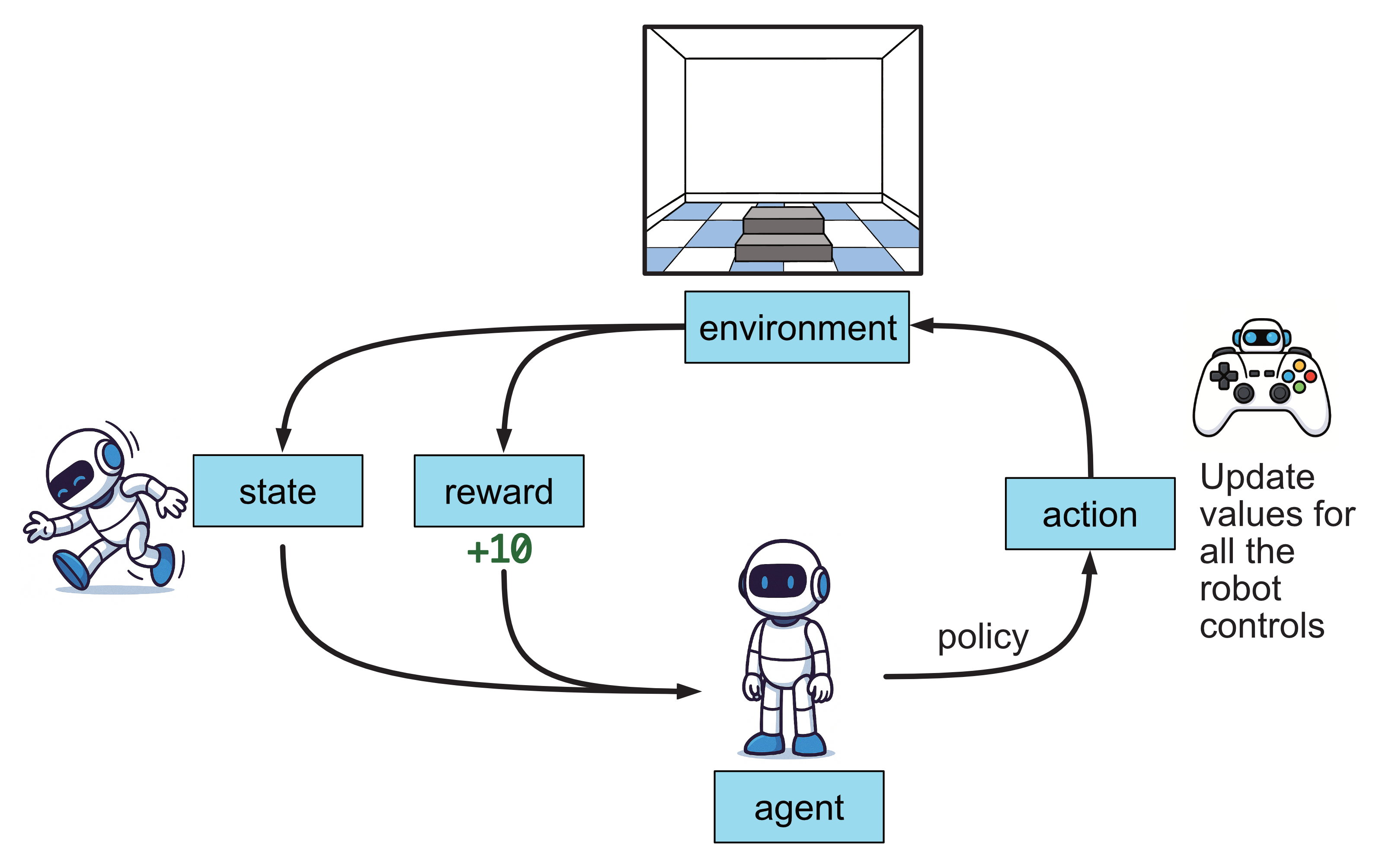 Another example might be to in teaching a robot to walk. The agent receives points for being able to stand upright and move forward. Over time, through trial and error the agent learns a policy to maximise the points it gets, and over time it is able to control the robot to enable it to walk.