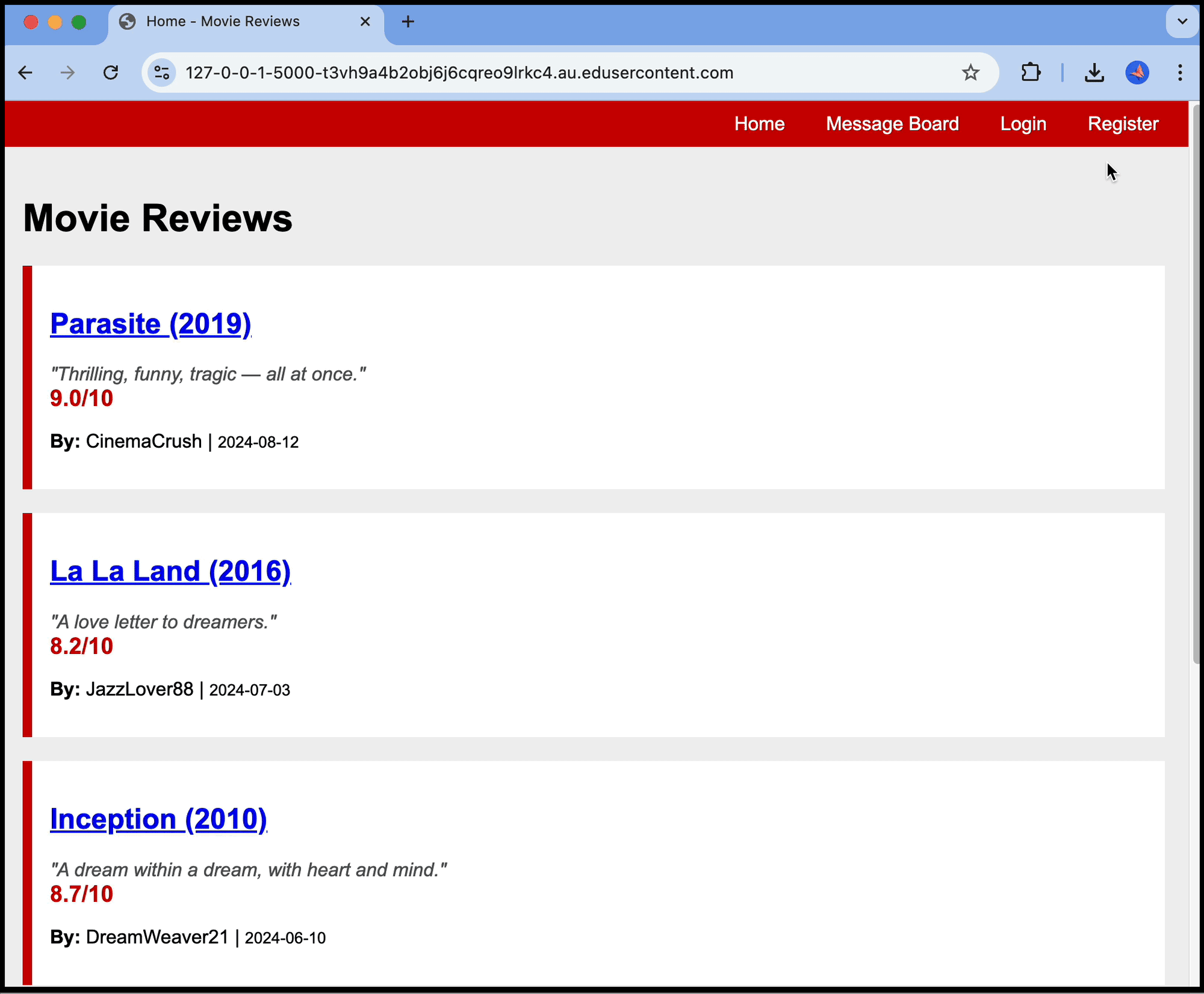 The owner of FlixReviews has teamed up with a user interface designer to create the look and feel of this message board. Your job is to bring that design to life by writing the necessary code and, most importantly, ensuring that it’s done securely. This means you’ll need to carefully plan how users post content, where data is stored, and how to defend against common web application threats.