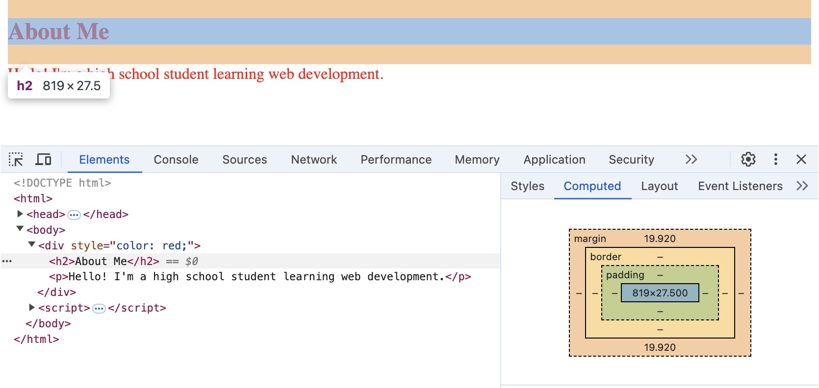 Web inspector view of an earlier example showing the margin of the <h2>#